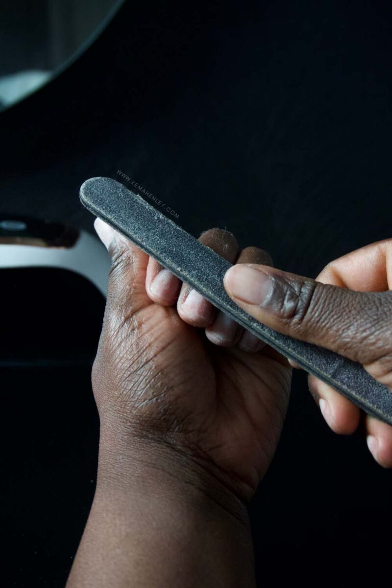 Will every box of press-ons you buy be perfect? No. So if you do find yourself in between sizes, you can use your hand file to slightly file down the sides to get a better fit. Sometimes you might even find that the press-on sits more square than round; simply file it to your desired shape. You want it to look as natural as possible.