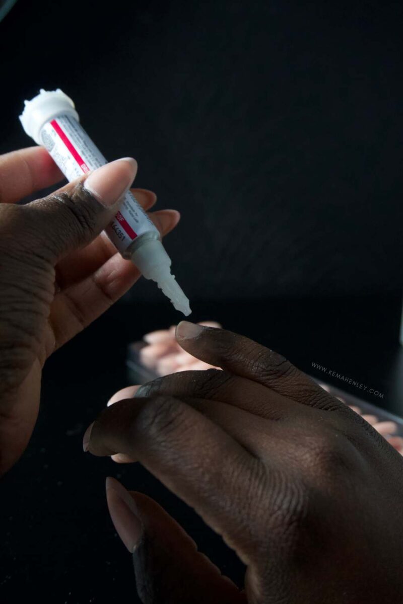Also, check underneath the press-on nail. If the press-on is shiny underneath, lightly buff the shine away. This is a tip a lot of people don’t consider, but it helps with longevity. You can use an electric file on low, or you can use a nail tip etching primer that will etch out the inside of the press-on nail for you.